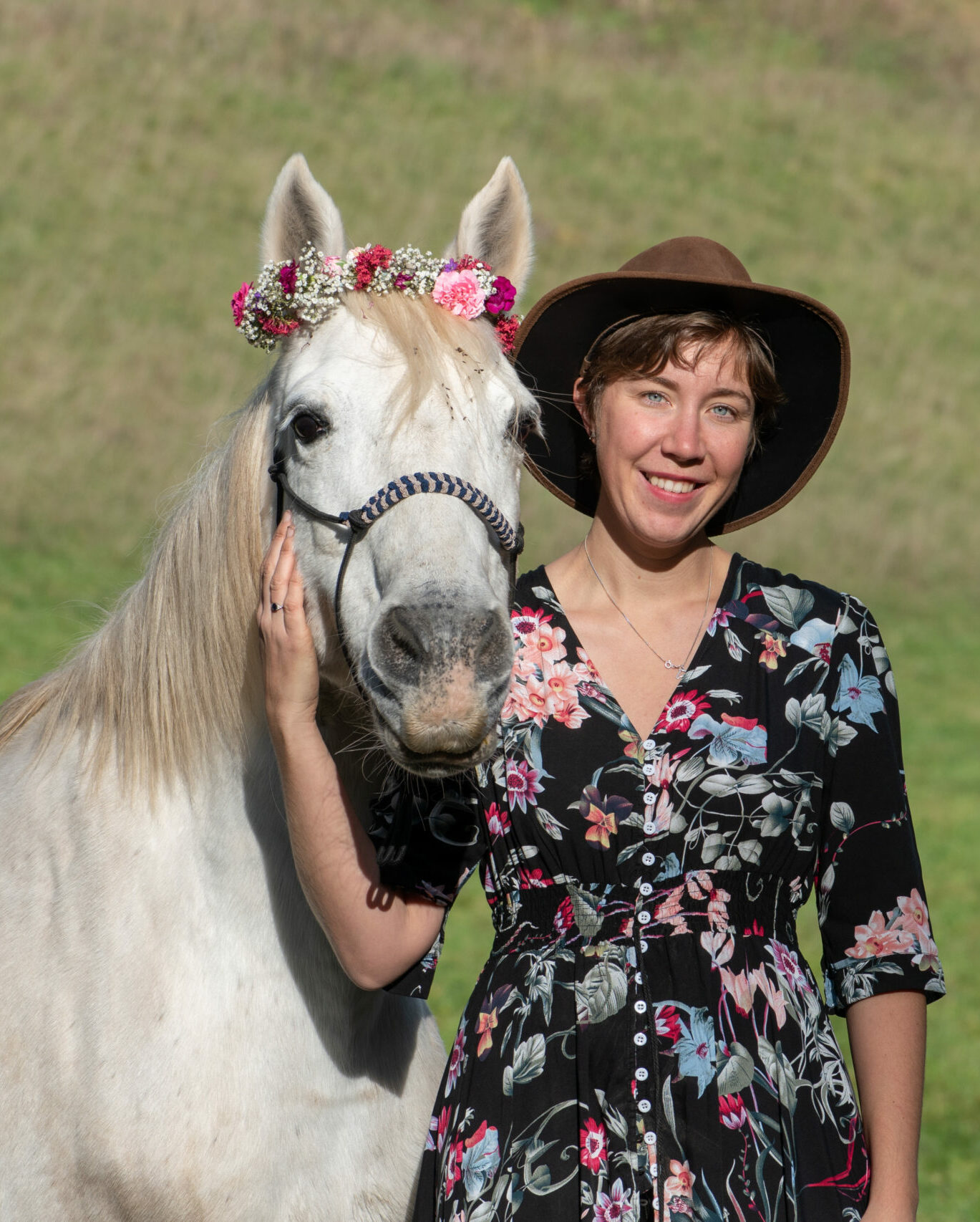 Aussi loin que je m'en souvienne, j'ai toujours rêvé d'être entourée de chevaux. Petite, je regardai "La Petite Maison dans la Prairie", et je m'imaginai avec une petite ferme à la campagne, avec des chevaux et une calèche en bois! Mon rêve a pris vie il y a quelques années, lorsque j'ai commencé à prendre des cours d'équitation alors que j'étais déjà adulte. J'ai acheté Lady, avec qui j'ai appris le travail à pied. Puis nous avons sauvé Poppy. Nous avons déménagé au coeur de la Haute-Marne, avons acheté une maison avec du terrain afin d'accueillir nos juments à la maison. J'ai toujours été fascinée par les chevaux de trait. En allant à leur rencontre, j'ai su que mon prochain cheval serait un cheval de trait! Et c'est ainsi que Dina est entrée dans ma vie. Avec elle, sont arrivées toutes les difficultés que rencontrent les propriétaires de chevaux lourds: Trouver du matériel adapté à ces gros chevaux. Une vraie prise de tête! Le choix est tellement limité... C'est pourquoi je me suis lancée dans cette grande aventure! Créer ma propre entreprise de fabrication de licols et matériel éthologique avec des produits pensés aussi pour nos chevaux de trait.