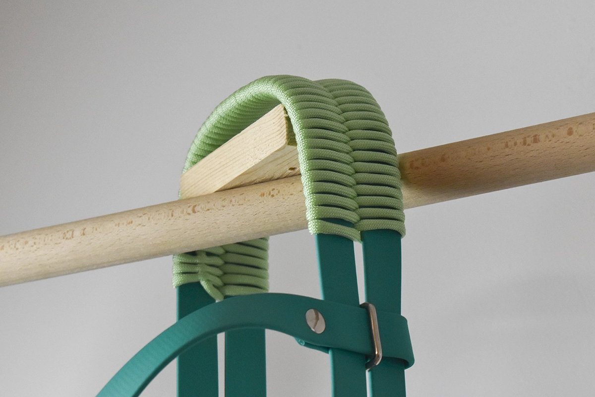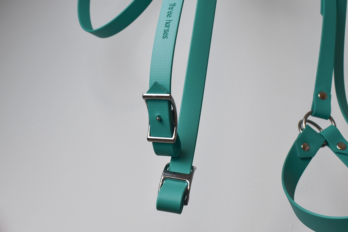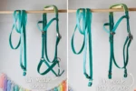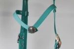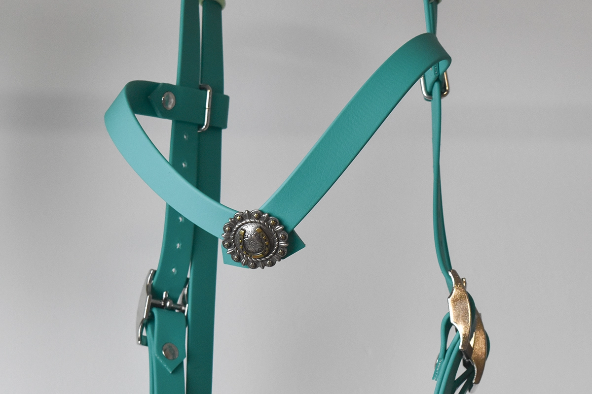 Le bridon dispose d’une têtière tressée vert pastel pour plus de confort et d’un frontal réglable en forme de V