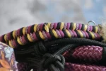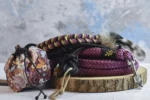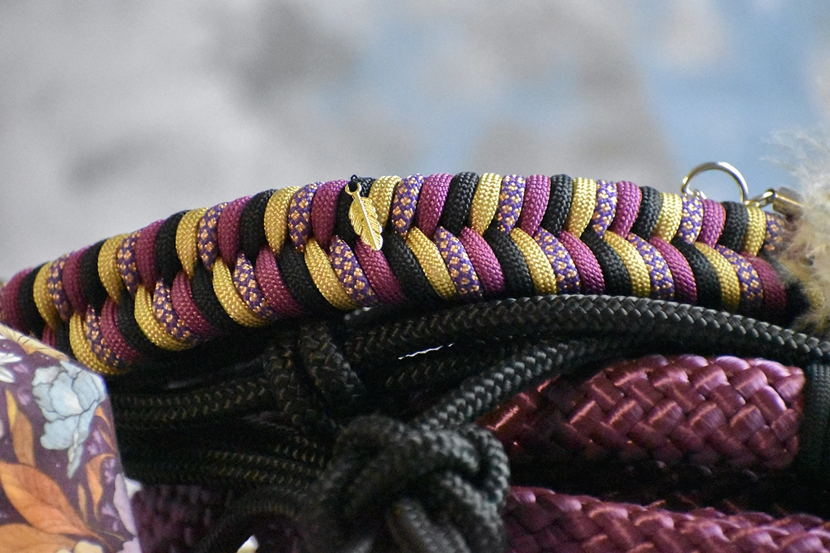 • D’un licol en corde avec muserolle tressée, noeud diamant et pendentif à plumes