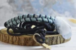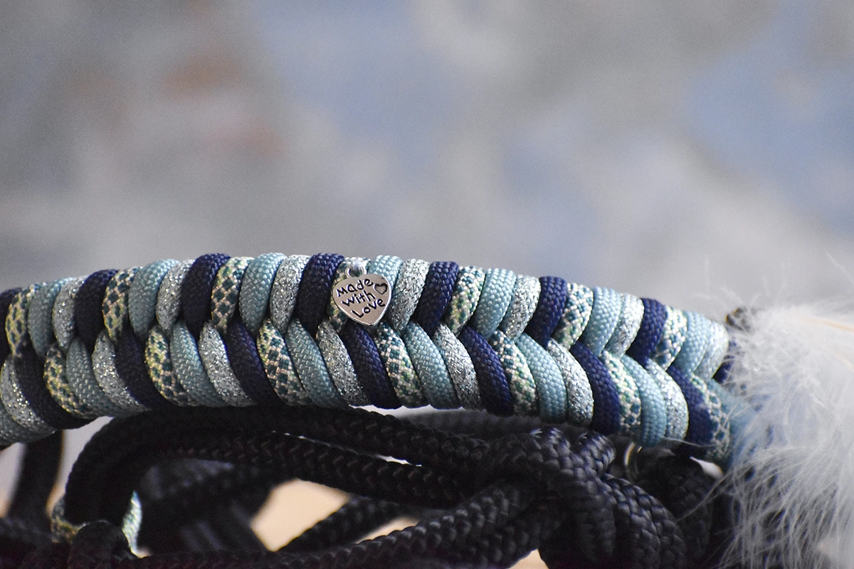 Licol en corde avec tressage de muserolle, une touche de paillettes et un pendentif plumes.
