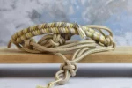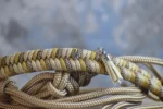 • Noeud fiador, aussi appelé noeud diamant sous l’auge: ce noeud, apprécié en équitation éthologique, est parfois difficile à rerégler pour les débutants. Lors de la fabrication de ton licol personnalisé, je peux stabiliser ce nœud afin qu’il soit fixe, il te suffit de me le demander dans la case “remarque”.