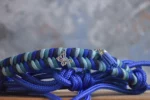 Ce licol en corde bleu est décoré avec un petit pompon amovible au niveau de l’attache de la têtière.