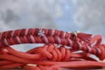 Ce licol en corde rouge 20est décoré avec un petit pompon amovible au niveau de l’attache de la têtière.