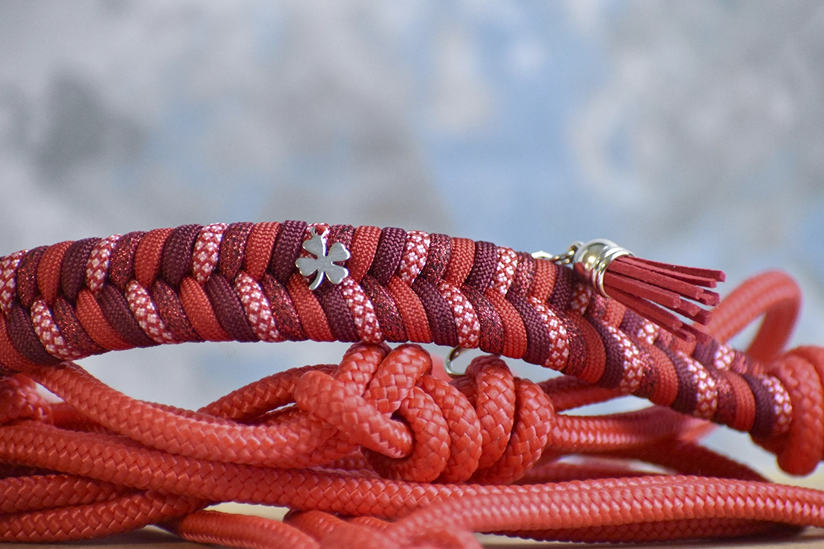 - Noeud fiador, aussi appelé noeud diamant sous l’auge: ce noeud, apprécié en équitation éthologique, est parfois difficile à rerégler pour les débutants. Lors de la fabrication de ton licol personnalisé, je peux stabiliser ce nœud afin qu’il soit fixe, il te suffit de me le demander dans la case “remarque”.