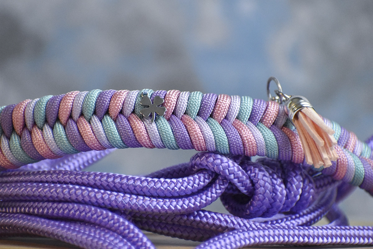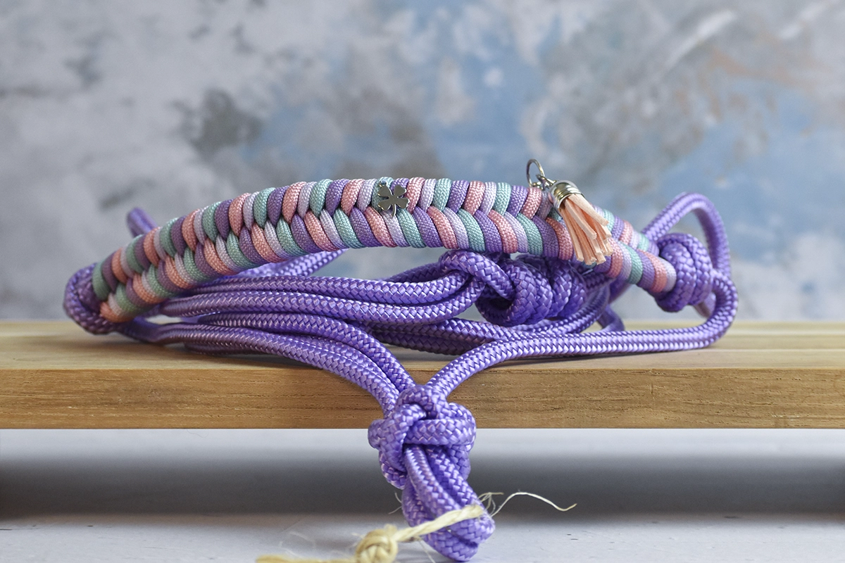 Conçus en corde polypropylène d’une épaisseur de 6 mm, mes licols éthologiques sont légers et agréables à porter pour les chevaux. Le tressage de la muserolle est fait avec des cordes légèrement plus épaisses que celles généralement utilisées pour les licols en corde. Elles permettent d’ajouter du confort sur le chanfrein du cheval grâce à leur côté moelleux sans gêner l’action des noeuds du licol.