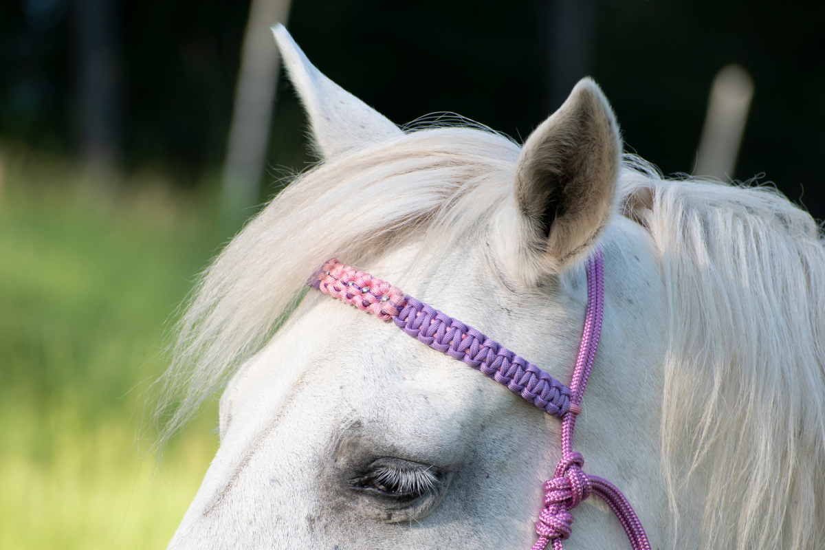 Tous les noeuds des licols en corde ont été réfléchis pour répartir correctement le poids de la longe et les actions des mains. Le noeud d’attache est un noeud diamant. S’il est prisé par les horsemanship, il est parfois délicat à rerégler pour les cavaliers débutants. Lors de la confection de ton licol, je peux stabiliser ce nœud diamant. Il te suffit de me le demander dans la case « Remarque », lorsque tu passes ta commande !