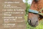 Si tu souhaites un licol sur mesure, découvre tous les détails sur la prise de mesure ici. Sinon, n’oublie pas de vérifier dans ce guide que la taille que tu choisis est adaptée à toncheval.