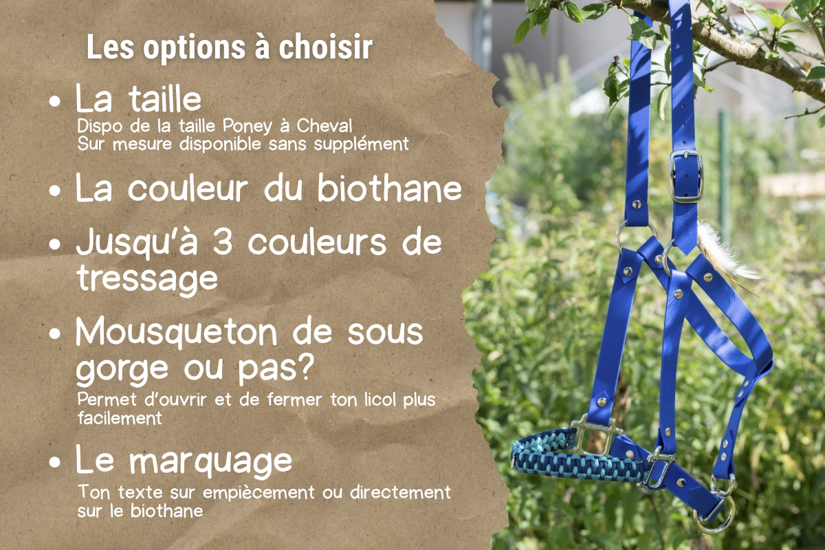 Le marquage dans le biothane est placé sur le montant gauche du licol.