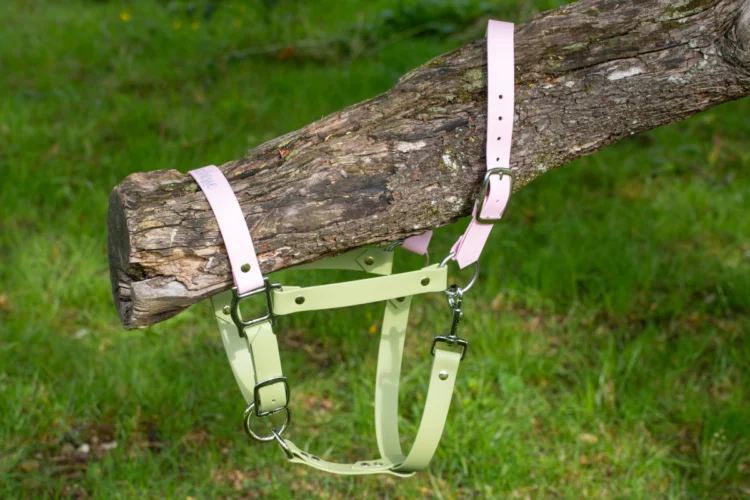 Le biothane est un peu comme du cuir, sauf qu’il n’est pas d’origine animale. Il est très résistant, doux et léger comme du cuir, mais plus facile d’entretien. Un coup d’éponge et il est propre. J’ai choisi de ne pas coudre mes licols et d’utiliser plutôt des rivets: cela permet de changer une pièce qui viendrait à s’abimer et à rallonger la durée de vie de votre licol.
